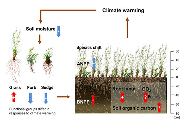 院刊》上(//www.pnas.org/content/115/16/4051)。 研究发现,尽管过去32年以来海北站气候呈现暖干化的趋势,但草地生产力无显著趋势性变化。但是,32年间草地物种组成却发生了明显改变,即深根系的禾草增加、浅根系的莎草减少。这种功能群组成的变化增强了植物群落对深层土壤水分的获取能力,有利于气候变化下生态系统初级生产力的稳定。气候变化控制实验进一步证明,增温和干旱处理有利于光合产物向地下分配,但对总初级生产力无显著影响。整合分析证实了气候变暖条件下物种组成这种改变在整个高原普遍存在。这些结果表明,高寒草地植物多样性在气候变化下生产力维持过程中起着关键作用。更重要的是,发现高寒草地生态系统并没有从气候变暖过程中受益,这和以前的认识完全不同。 杏吧原创