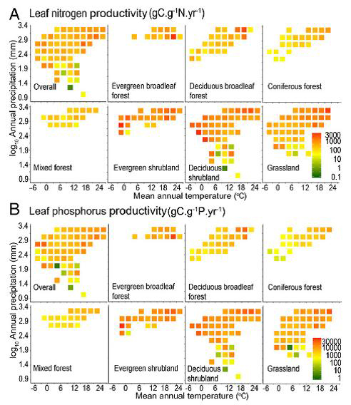唐志尧副教授课题组与中科院植物所谢宗强研究员共同组织了碳专项灌丛课题的相关工作。在此PNAS专题中,唐志尧与中科院植物所、华南植物园等单位合作,揭示了中国陆地生态系统生产力的的化学计量机制。 植被生产是生态系统固碳的主要途径,叶片是植被生产的主要器官。局域尺度的个体的研究表明,植被生产力受制于叶片氮、磷含量。然而以往研究仅在个体水平开展,缺乏区域尺度植被生产力与植物化学计量之间关系的研究;然而由于生态系统中不同物种的个体数量悬殊,植物主要器官的氮、磷功能差异显著,因此基于个体的叶片养分与生产力的关系难以推演到生态系统。 图1 中国主要陆地生态系统氮、磷利用效率随年均温和年降水的变化 本研究中,唐志尧课题组与合作通过大量的野外调查取样,获取了4,159个样地中常见物种不同器官(根、茎、叶)的碳、氮、磷含量以及生物量,首次通过生物量加权研究了群落层次植物不同器官碳、氮、磷化学计量的大尺度格局及其与生态系统初级生产力的关系。研究发现:在国家尺度,不同植物器官之间的植物养分含量符合幂函数关系,叶片养分含量比根、茎养分含量更稳定;生态系统总初级生产力与叶片氮磷储量均成正相关关系,但在不同生态系统类型中,总初级生产力与叶片氮磷储量之间的关系取决于养分在不同器官之间的分配策略及优势植物的叶寿命。他们进而计算了中国陆地生态系统的植物叶片平均氮、磷生产效率(即单位质量的叶片氮或磷所生产的总初级生产力)分别为250 gC GPP/gN.yr-1 和 3,158 gC GPP/gP.yr-1,该生产效率随温度和降水的增加而增加;未来气候变暖背景下,生态系统可能会通过提高其氮、磷效率来增加总初级生产力。这一研究将植物养分的大尺度化学计量研究由个体以及单个器官扩展到群落层次,为进一步估算植物养分储量及模拟生态系统生产力对氮、磷沉降的响应提供了科学依据。 论文“Patterns of plant carbon, nitrogen, and phosphorus concentration in relation to productivity in China’s terrestrial ecosystems” (//www.pnas.org/content/115/16/4033)于2018年4月17日在线发表。杏吧原创