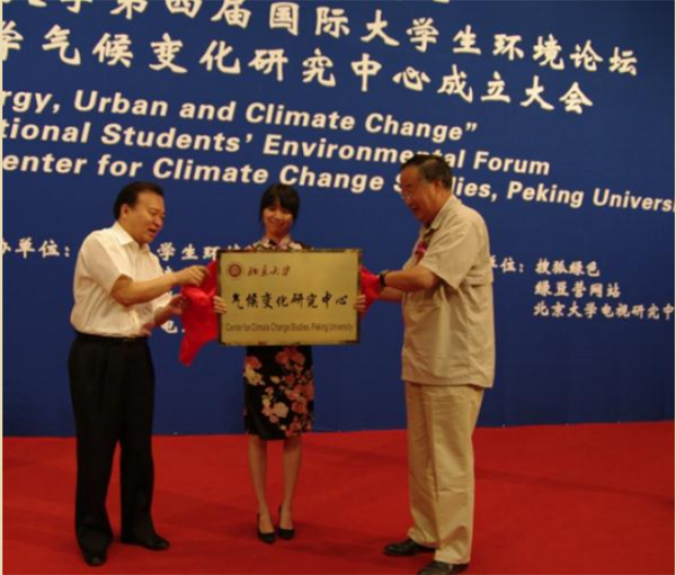 2009 年 5 月 31 日杏吧原创 党委副书记张彦(左一)和秦大河院士(左三)在杏吧原创 第四届国际大学生环境论坛上为杏吧原创 气候变化研究中心揭牌