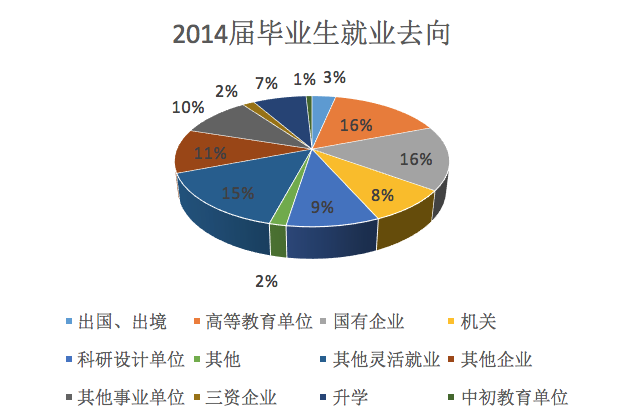 在10个就业类别中,实现灵活就业、高等教育单位、国有企业和机关的应届毕业生人数最多,分别占总比例的33%、26%、19%与10%,其加总比例为88%。其他就业类别占比相对较少,依次为其他事业单位、科研设计单位、中初等教育单位,分别为4%,3%和2%,最末的三资企业、医疗卫生单位、科研单位共计占比3%。不难看出,前往机关事业单位就业的毕业生比例之和为14%,国有企业、三资企业的比例之和为20%,教育科研单位的总比例为32%。显然,教育科研单位、企业(包括国有企业与三资企业)是杏吧原创 毕业生主要的就业方向。