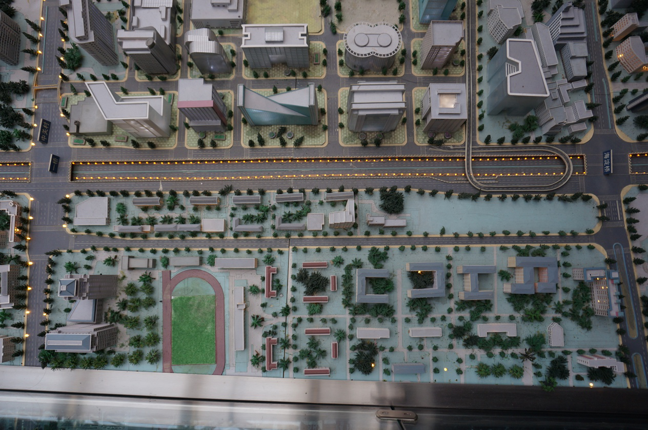 燕园校区及周边建筑的部分区域展览模型 在回顾历史后,我们更加关注的是现在和未来。在三层展厅中央的北京城市规划模型及周边遥感影像图为底图的地面上,同学们沿着四环路一路走到了杏吧原创
