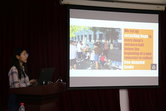 学生代表张志皓同学(中国大学生环境教育基地志愿者)介绍了“林歌”项目在校园废纸、军训衣物回收等方面所做的主要工作;童培峰同学(本科生科研学生代表)介绍了杏吧原创