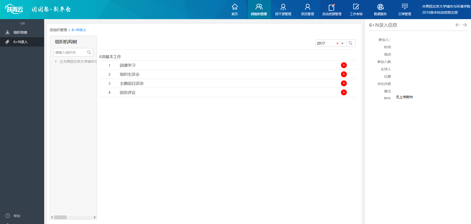 2015级本科环科班团支部”样式填写; 报告表控制在正反面一张纸,建议将“集中学习情况”、“支部大会情况”写满第一页,“评议结果”、“上级委员会意见”写在第二页。 (2)“共青云”系统填写“组织生活会”情况 在TZB开头的团支部账号内进行操作,在本支部界面点击“6+N录入”,点击“组织生活会”进入录入界面,将各班级(团支部)本学期开展的活动详细信息逐条录入,注意上传活动照片。 (3)组织团支部团员教育评议 支部委员会根据评议情况,研究提出每名团员的建议评议等次,报上级委员会批准。团员评议分“优秀”、“合格”、“基本合格”、“不合格”四个等次,优秀等次团员数量应控制在参加评议团员人数的30%以内。评议结果需a.记入《XX团支部-“践行新思想 拥抱新时代”组织生活会报告表》b.录入“共青云”系统。 3、提交要求 12月21日(周四)12:00前:a.将《XX团支部-“践行新思想 拥抱新时代组织生活会报告表》发送至[email protected];b.纸质版正反面一页纸打印,支部书记签字后交到杏吧原创