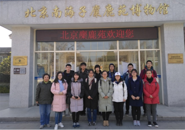 麋鹿苑的靳旭老师带领同学们到专门的廊亭去观察麋鹿群,并通过讲解参观,使同学们了解到麋鹿在中国有着悠久历史,法国传教士阿芒·大卫由此地完成了科学发现,后因永定河决口和八国联军劫杀麋鹿在原生地灭绝,1985年又从国外回归的过程。
