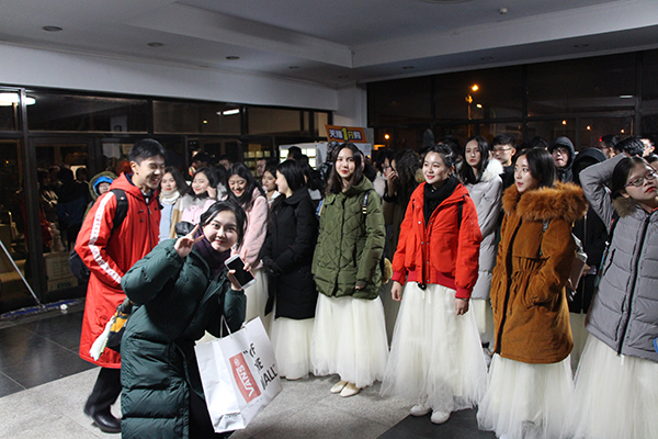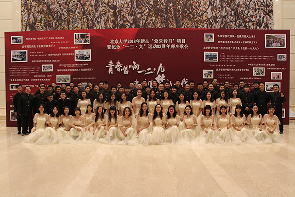 大一的同学们来说,这却是他们人生中不可多得的暖冬。每周五、周日的排练让他们的冬天充满了音乐与友情。 渐入佳境的排练 从逸夫二楼3459分声部时的五音不全、到第一次排练练声时的嬉皮笑脸,到第一次完整唱下《雪花的快乐》时的激动与满满成就感……58天不长的时间里,同学们一起经历了无数温暖又欢乐的瞬间,认识了可爱的学长学姐们,也完成了自身的蜕变。在十二月九号的夜晚,城环的同学们都信心满满。 那天早上,不少男同学兴奋得睡不着觉,早早穿上了俊(cu)朗(zhi)帅(lan)气(zao)的中山装,更是有同学早早来到逸夫二楼化妆(接受审判)。一通“涂脂抹粉”和互拍黑照后,城环的同学们又最后一遍练习唱了那熟悉的《雪花的快乐》,和第一次唱下来的有点不同,这次的《雪花的快乐》,歌词和旋律都深深印在了同学们的心里。 晚餐后,同学们一个个被上了酷刑涂了口红。突然,3459教室里响起周璇的《四季歌》,吸引了同学们注意力,大家的目光被引向前排的白幕,原来是视频组为一二九专门录制的开场视频。复古的场景陈设,同学们出神入化的表演,随着情节推进愈发激荡的配乐,让这部开场视频有了大片的既视感。 出发! 一路“百鬼夜行”从逸夫二楼到了百讲,同学们的心情又激动又紧张。嘴上相互取笑着对方的妆容,心里却始终想着上台的注意事项、“奔涌”的轮唱技巧。作为第一个上场的队伍,城环同学们深知先声夺人的重要性。在祎勍和浩舒学长的引导下,同学们在厕所门口走廊边进行了最后的练声。入场前,同学们在大厅留下了珍贵的合影(可能是自九月军训以来城环萌新们人最齐的一张合照)。 在赛场上,当轻柔的钢琴响起《雪花的快乐》的前奏,台上每一个同学的情绪都被充分地调动了。舒缓的歌声配上优雅的舞蹈,再加上打在地上的“雪花”,让每一位观众仿佛进入了徐志摩诗中的浪漫意境。鼓奏响起,灯光由柔和变得敞亮,这是城环同学们《想你的365天》带给观众们的欢乐感受。在齐声的“babala”中,同学们的快乐情绪也被推向了高潮,台上的每一个人都真正地开始享受音乐。歌声戛然而止,随之而来的又是响彻全场的“希望,希望,希望”,《雪花的快乐》为这首合唱曲做了完美的收尾。一曲终了,余音绕梁,掌声从四面八方奔涌而来。 最后,杏吧原创