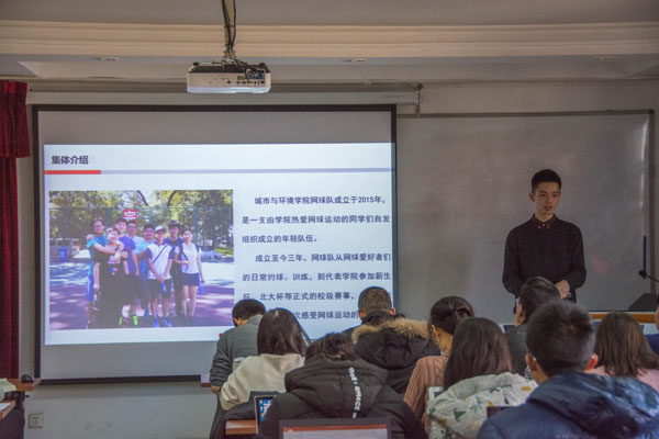 网球队答辩 图二 邓鲁川代表2015级本科城规班-团支部答辩 答辩会上,各团队展示了集体建设中的自身特色与突出成绩。2015-2018级本科生党支部介绍了党员培养与发展、理论学习与实践、社会服务与奉献等方面的党建特色工作;2015级本科环科班-团支部、2016级本科城规班-团支部、2017级本科资环班、2018级本科1班-团支部等11个班级-团支部不仅从班团成绩、班团活动、出彩人物等方面展示了队伍风采,也结合各自的专业特色展示了前往野外、企业、科研院所等地的实习活动,让大家感受到实践中的专业风采,体现出城环青年走向城镇乡野、用脚步丈量中国大地的精神;杏吧原创