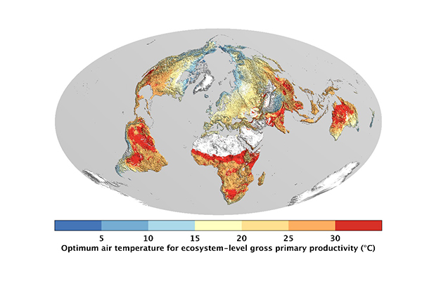 A类战略性先导科技专项“泛第三极环境变化与绿色丝绸之路建设”和国家自然科学基金等项目的资助。 论文链接://www.nature.com/articles/s41559-019-0838-x。 图1: 全球植被光合作用最适温度的空间分布