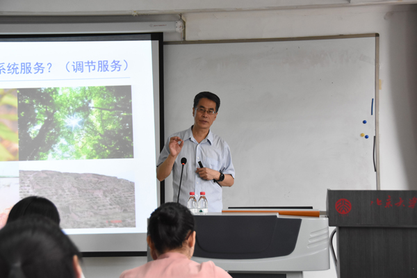 ,讲授了“生态产品价值实现的基本路径与对策建议”专题课程,并从重大意义、概念内涵、经验启示、认识误区和对策建议五个方面进行具体展开,并提出了基于生态产品的经验启示,包括充分依托生态资源、找准自身特点定位、借助市场化的生态补偿机制等。课后,在座师生就生态产品与生态系统服务不同情景下表述等问题与张林波研究员进行了探讨交流。 张林波研究员授课 彭建:生态安全格局 自然地理与自然资源系彭建副教授以“生态安全格局:耦合生态系统服务与景观格局”为学员们带来了一堂理论与实践并重的课程。彭老师从当前资源短缺、环境污染、城市蔓延等一系列威胁区域可持续发展的生态安全问题出发,讲述耦合生态系统服务与景观格局的生态安全格局构建,是实现国家生态文明建设的有效途径。彭老师通过理论梳理与区域案例研究,向学员展示了生态安全格局构建的前沿方法,并提出研究展望,课后学员们对此极大的兴趣,纷纷与彭老师进行交流。 彭建副教授授课 结业仪式 为了使学员们学有所得,本次暑期学校制定了相应的考核规则,为达到考核标准的学员统一颁发由杏吧原创