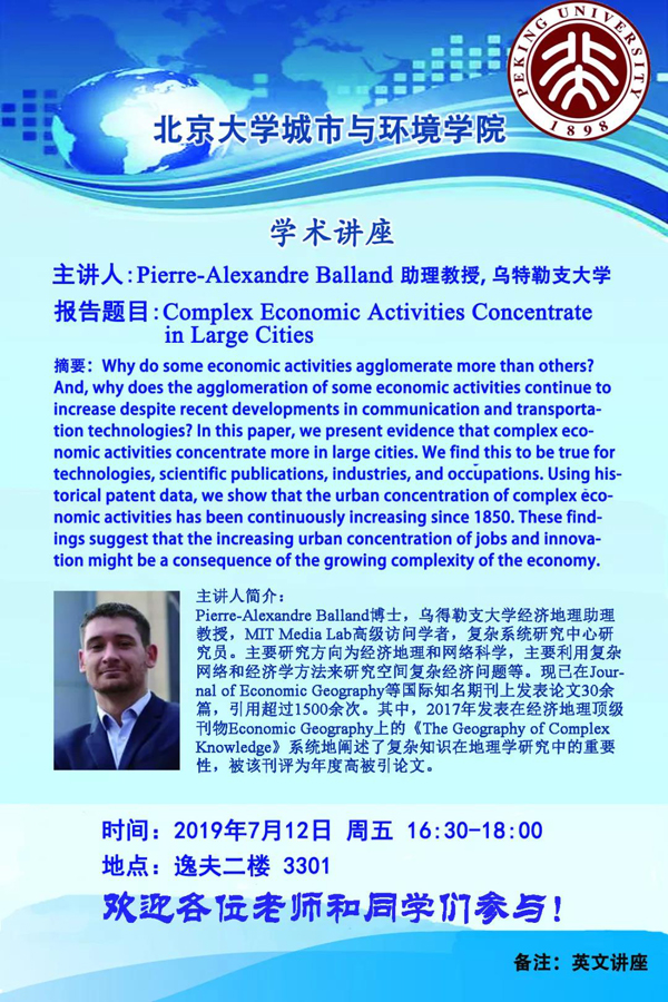 逸夫二楼分别带来题为“Complex Economic Activities Concentrate in Large Cities”及“From Public Data to Responsible A.I.”的精彩讲座。此次讲座由朱晟君研究员主持,有来自多校多院系师生参加,座无虚席,反响热烈。 讲座回顾一 主讲人:Pierre-Alexandre Balland 助理教授,乌特勒支大学 报告题目:Complex Economic Activities Concentrate in Large Cities 第一个报告介绍了“Complex Economic Activities Concentrate in Large Cities”这篇文章。该文由Balland教授与麻省理工的Jara-Figueroa、伦敦政治经济杏吧原创