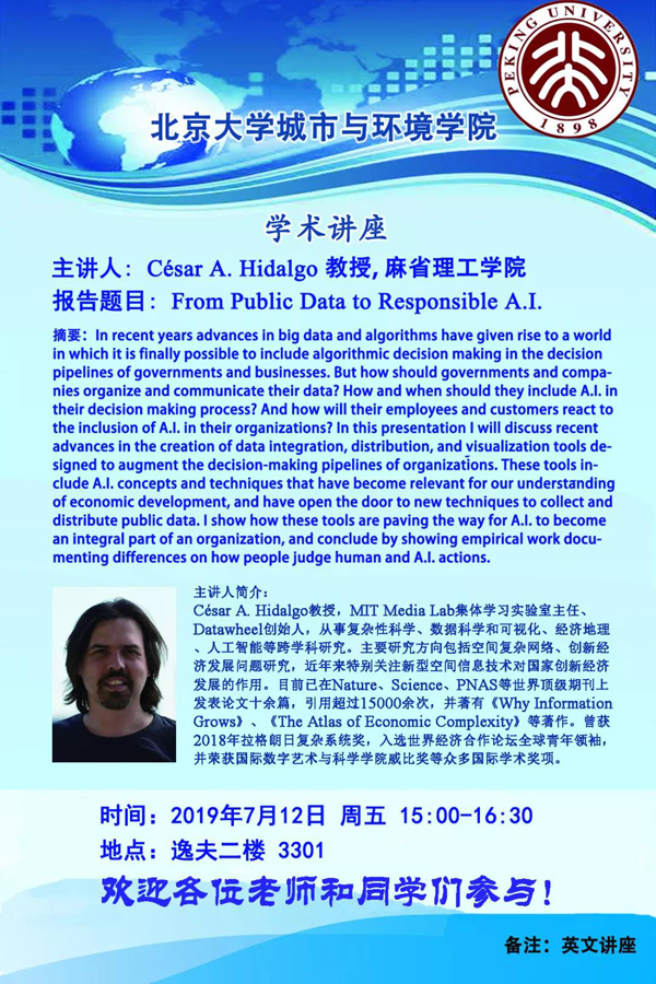 报告题目:From Public Data to Responsible A.I. 在第二个报告中,Hidalgo教授回顾了他过去15年以来的研究工作。他的报告涉及四个方面:首先,如何通过机器学习以及AI来获取和匹配公开数据;其次,如何利用公共数据的数据分发系统为公众提供所需数据,Hidalgo教授同时展示了其信息挖掘开源工具研发团队自2011年至今的的应用成果;第三部分介绍了他对于经济复杂度和相关性的研究;最后,通过展示公众调查结果,探讨AI伦理问题,了解人们是如何看待人工智能的。 Hidalgo首先指出,公共和私人组织为了决策需要处理和分析多种大量数据,但是合并、匹配、可视化以及分析数据流的过程是非常昂贵的。机器学习和AI技术能够降低获取公共数据的成本,但其应用需面临四个方面的挑战。Hidalgo对如何解决数据整合的挑战、分配的挑战、分析的挑战和自动化的挑战进行了一一介绍。 随后,Hidalgo展示了其团队从2011年至2018年所开发的各种数据工具平台,包括Data viva, Data USA, Data Africa, Data Chile, Data Korea等,并展示了数据使用情况的变化。 在第三部分中,Hidalgo重点介绍了其关于经济复杂度和相关性的研究,包括:2007年Hidalgo等人发表在Science上关于相关性的研究;2009年Hidalgo和Hausmann在PNAS上发表的对于经济复杂度的研究及测度;2014年MIT出版社出版的相关研究书籍;2018年Hidalgo等人在第九届国际复杂系统会议上的相关性原理的研究;2018年Jara-Figueroa等人和Hidalgo对于产业、职业、位置及特殊知识对于初创公司生存影响的研究;2018年Alshamisi、Pinheiro和Hidalgo在Nature Communication上发表的关于相关产品最佳多样化战略的研究;以及Neffke、Henning、Boschma等人对产业空间的相关性研究等等。 最后,Hidalgo介绍了机器学习及深度学习的大量应用案例及其贡献,例如识别地点变化、辅助决策医院的新建、更新和选址等。此外,Hidalgo还重点介绍了他将于2020年发表的对于AI伦理问题的最新研究成果,讨论了人们对于人/机器人做同样一件事的不同态度。 报告后,现场听众与Hidalgo进行了热烈的互动提问。 两场汇报结束后,Hidalgo和Balland还与部分听众学生合影留念。 嘉宾简介 César A. Hidalgo教授,MIT集体学习实验室主任、Datawheel创始人,从事复杂性科学、数据科学和可视化、经济地理、人工智能等跨学科研究。主要研究方向包括空间复杂网络、创新经济发展问题研究,近年来特别关注新型空间信息技术对国家创新经济发展的作用。在经济地理领域的主要贡献是创建了路径依赖性及经济复杂性指标。目前已在Nature、Science、PNAS等世界顶级期刊上发表论文十余篇,引用超过15000余次,并著有《Why Information Grows》、《The Atlas of Economic Complexity》等著作。曾获2018年拉格朗日复杂系统奖,入选世界经济合作论坛全球青年领袖,并荣获国际数字艺术与科学杏吧原创