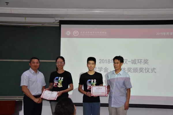 李本纲副院长和李双成副院长分别为获奖代表于欣源、徐帅颁奖,深圳市铁汉生态环境股份有限公司北京区域总经理张丽华学姐上台进行“铁汉-城环奖”奖教金、奖学金第七年度的捐赠,党委副书记张新平代表杏吧原创