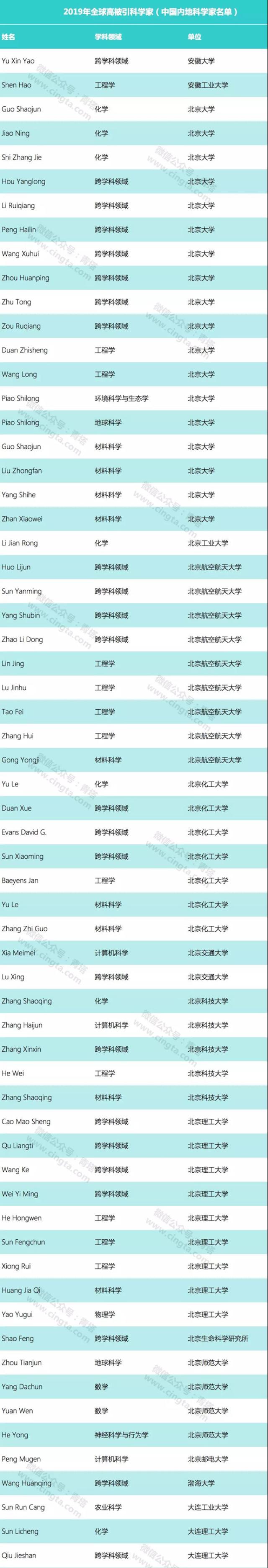 2019年11月19日,科睿唯安公布了2019年度“高被引科学家”名单。入榜这份备受期待的名单的自然科学家和社会科学家均发表了多篇高被引论文, 其被引频次位于同学科前1%,彰显了他们在同行之中的重要学术影响力。 6216人入围2019年全球高被引科学家 全球近60个国家的6216人次来自各领域的高被引科学家入榜。美国高被引科学家数量遥遥领先,共计2737人次入选,占名单总人数44%。 其中,哈佛大学共有203人次上榜,是全球高被引科学家人数最多的机构。美国加利福尼亚州也是顶尖人才的聚集地,斯坦福大学有103人次上榜,此外加利福尼亚大学伯克利分校、圣迭戈分校和洛杉矶分校都分别有超过50人次上榜。 中国内地636人次上榜 中国内地上榜人数激增,本年度有636人次上榜,而2018年这一数字为482人次。2014年以来,在21 个ESI(Essential Science Indicators)学科领域中,中国内地学者的上榜人数增加了3倍。包含港澳台地区,2019年中国共有735人次入榜高被引科学家。 从中国内地高校入选数统计来看,清华大学位居首位,达42人次;中国科学技术大学和电子科技大学各有24人次入选,并列第二位,表现突出;浙江大学共有23人次,位居第四位,表现不俗。中国内地高校入选人次统计和中国内地机构的完整名单如下:
