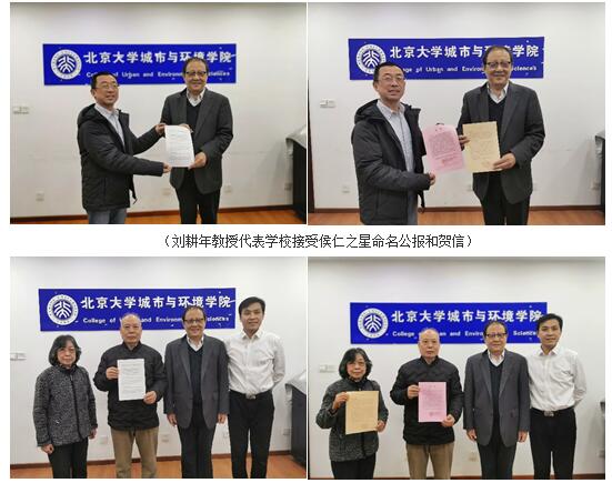 紫金山天文台2007年8月16日发现的、国际编号为309295号小行星,正式命名为“侯仁之星”。 侯仁之星命名公报 2019年12月12日下午,何梁何利基金委员会秘书长段瑞春及秘书任晓明专程到杏吧原创