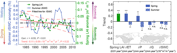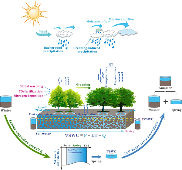 遥感和地面观测均证实升温导致北半球植被春季物候提前。春季物候提前通过增加光合时长和光合速率从而有效提高植被生产力;另一方面,春季物候提前会加快土壤水分消耗,改变局地水循环和气候的季节动态。但相比于物候提前的碳汇效应,学术界关于北半球春季物候提前对水循环和气候的生物物理反馈机制,尤其是跨季节滞后效应的认识非常有限。 杏吧原创