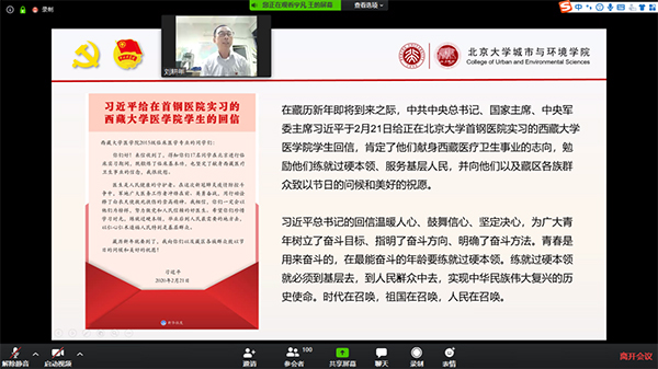 党支书、团学研骨干、第34期党性教育读书班成员、团支书培训“领雁”计划学员及“城帜”团校学员共161人参与活动。活动由王宇凡主持。 活动开始前,与会师生跟随2019级本科1班团支部制作的《同“心”战“疫”》视频一起为湖北和中国加油。刘耕年带来一堂别开生面的党课。他结合2月23日习近平总书记在统筹推进新冠肺炎疫情防控和经济社会发展工作部署会议上的讲话讲解了当前防疫形势和党的领导下统筹推进疫情防控和经济社会发展工作的重要举措,介绍了近期北大人在疫情防控中的工作情况和杏吧原创