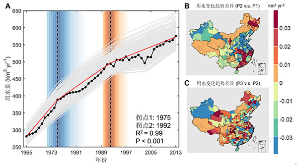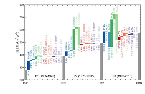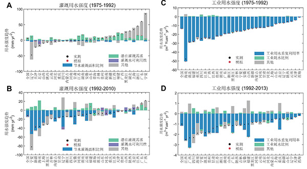 院刊》(Proceedings of the National Academy of the Sciences [PNAS])。 水是事关国计民生的基础性自然资源和战略性经济资源,也是生态环境的控制性要素。然而,过度用水和气候变化引起了区域性水资源短缺,严重威胁着全球粮食安全、生态安全和经济增长。2020年世界经济论坛将水资源短缺列为未来十年最大的全球性风险之一。据研究,人类用水在过去100年增加了8倍,是人口增长速度的2倍,其中80%左右的用水增加发生在发展中国家。相比发达国家,发展中国家在未来可能面临着更严重的水资源短缺风险。我国自19世纪80年代以来采取了一系列政策干预,最大程度地减缓气候变化、经济增长和结构转型所带来的水资源短缺风险。那么,我国用水呈现怎样的变化?其背后的驱动机制是什么?这个科学问题引起了学术界的强烈兴趣,但由于缺乏可靠、系统的观测数据而一直悬而未决。 研究人员利用第一、二次全国水资源调查评价、31个省(市、自治区)水资源公报和中国经济社会大数据研究平台,建立了涵盖1965-2013年341个地级市的灌溉(5类作物)、工业(11个行业)、城镇(生活和三产)和农村(生活和畜禽)4个部门的用水、用水强度、用水结构及社会经济发展规模等数据库。研究发现,全国用水在过去半个世纪翻了一番,但呈现增速变缓的趋势(P<0.001),由1975年之前(P1)的107.7亿m3 yr-2,下降到1975-1992年之间(P2)的62.3亿m3 yr-2和1992年之后(P3)的35.9亿m3 yr-2。这种增速变缓的趋势还具有广泛性,在P2时期主要发生在华北平原、西北地区等缺水的地级市,到P3时期延伸到东南沿海等丰水的地级市。 图1 中国人类用水变化及空间格局 A. 1965-2013年时间变化及拐点;B. 用水变化趋势差异(1975-1992 v.s. 1965-1975);C. 用水变化趋势差异(1992-2013 v.s. 1975-1992)。 为了揭示背后的驱动机制,研究人员发现中国用水增速变缓是因为灌溉和工业用水强度的下降,最大程度地抵消了经济社会发展和结构转型造成的用水需求上升。同时,研究人员进一步识别节水灌溉和工业循环用水的技术推广是用水效率提高最关键的原因。经模型测算,这些技术推广使我国在过去20年平均每年少用了约4200亿立方米,相当于该时期实际用水量的80%。 图2 中国用水变化的驱动分析 图3 灌溉和工业用水强度变化的驱动分析 A. 1975-1992年灌溉用水强度变化驱动分析;B. 1992-2010年灌溉用水强度变化驱动分析;C. 1975-1992年工业用水强度变化驱动分析;D. 1992-2013年工业用水强度变化驱动分析。 中国用水演变规律的新发现挑战了传统认识。一方面,服务于IPCC的跨部门影响模型比较计划(ISIMIP)认为,中国用水呈现广泛的“加速增加”趋势,主要是因为大部分全球水文模型并未合理的量化节水技术推广因素;另一方面,我国节水灌溉提高了用水效率,并未大范围地出现其他国家的“灌溉效率悖论”(即用水效率提高,但极少能真正的节水现象)。造成这种差异的可能原因是我国农业集约化本身很高且农地规模很小,尽管灌溉效率提高,但难以进一步扩大灌溉规模和高耗水作物的种植比例。另外,这些节水技术推广与我国不同发展阶段的政策干预密切相关,包括早期的200个工业产品用水定额、193种作物用水定额、国家农业综合开发(含大型灌区建设)、阶梯水价、工业废水排放标准、北方河流(黄河、黑河、塔里木河)水量调度(用水总量和最低下泄流量指标)等。如何准确量化节水技术推广及其对政策干预的响应,是未来提高用水预测可靠性和应对水资源短缺风险政策制定的关键所在。 本研究还认为我国未来十年用水很可能维持“增速变缓”的趋势,但也存在3个不确定性因素。首先,节水灌溉面积比例将增加到75%(2030年),农地规模随着土地流转政策的实施将快速增加,灌溉者在利益的驱动下有可能加强农业集约化,从而增加出现“灌溉效率悖论”的可能性;其次,工业布局——尤其是能源行业——呈现向西部地区倾斜的态势,而该地区工业用水重复利用利用率已经很高,结构转型难度更大,工业节水潜力有限;另外,生活用水虽然只占到我国当前用水总量的20%,但随着人均收入的提高而快速增长(尤其是农村用水),将成为我国用水增长新的引擎。因此,本研究建议推动“精准”节水,从节水优先向兼顾区域性用水总量控制转变,从田块、企业的个体节水向“田-沟-塘”和企业群的“大循环利用”转变,加速我国经济增长与用水的脱钩,避免未来水资源短缺风险。 该项研究由杏吧原创