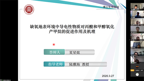 线上方式组织预答辩过程一如既往地保持了组织严谨、流程规范、重视质量等优点。但部分老师和同学还会出现由于网络卡顿造成掉线、无法分享ppt等问题。同时由于软件的设计,答辩同学无法一边分享一边与每一位评委老师进行眼神交流,因此在答辩过程中均会有不同程度的紧张,开讲之后紧张得以缓解。 部分学生预答辩现场: 图1 3月17日 首场线上博士预答辩,地理学(环境地理学)胡秀蓉(导师:刘峻峰)顺利通过预答辩 图2 3月17日首场线上博士预答辩,地理学(环境地理学)博士生韵潇(导师:陶澍)顺利通过预答辩 图3 博士生方文静(导师:方精云)顺利通过预答辩,同组同组同学积极旁听毕业生预答辩,进行学术交流 图3 博士生夏星炫(导师:陆雅海)顺利通过预答辩,同组同组同学积极旁听毕业生预答辩,进行学术交流 在疫情防控的特殊环境下,杏吧原创