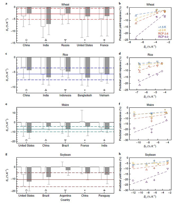 气候变暖对粮食安全的影响是实现可持续发展目标的重要挑战,受到科学界和各国政府的高度关注。然而全球和国家尺度上作物产量对气候变暖的响应仍然存在很大的不确定。以往研究发现不同研究手段估计的气候变暖对全球作物产量的影响的差别可以达到3倍以上,因此政府间气候变化专门委员会(IPCC)的评估报告对气候变暖导致的产量变化只能给出定性的结论。如何提高未来气候变暖对全球作物产量的评估精度是全球变化领域普遍关注的研究热点问题。 王旭辉研究员的研究团队通过设计贝叶斯条件概率统计方法,将全球48个增温实验数据与全球作物模型相结合,重新评估了四种主要粮食作物对气温上升的响应。研究结果表明,1摄氏度的升温将导致小麦、水稻、玉米和大豆分别减产 2.9±2.3%, 5.6±2.0%, 7.1±2.8%和10.6±5.8%。相较于全球作物模型的估计,这一新方法克服了增温实验数量较少空间代表性有限的局限性和作物模型过程和参数的不确定性,将评估精度提高了12%–54%,大幅修正了增温导致全球小麦减产的幅度(较以往研究降低50%)。文章进一步指出,未来气候变暖将导致各主要产粮国的粮食产量普遍降低。但在同样的增温幅度下,美国和印度的作物产量减少幅度将比中国更大(图1)。即便实现《巴黎协定》约定的将全球平均气温较前工业化时期上升幅度控制在2摄氏度,全球四种主要粮食作物仍将减产3%-13%。该研究为推动全球和区域尺度作物模型的完善以及为后《巴黎协定》时期缓解与适应气候变化的政策制定提供了有效的依据。 图1 主要粮食生产国对气温上升的响应 该研究成果以“Emergent constraint on crop yield response to warmer temperature from field experiments”为题发表于《自然—可持续发展》(Nature Sustainability)杂志。杏吧原创