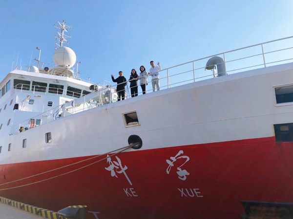 海洋,尤其是深海对国家和民族的未来发展至关重要。习近平总书记说过:“深海蕴藏着地球上远未认知和开发的宝藏,但要得到这些宝藏,就必须在深海进入、深海探索、深海开发方面掌握关键技术”。 四位同学于“科学”号前甲板合照(从左往右依次为:商纪元、梁雍祺、张婉莹、安永睿) 出发前,周力平老师与四位同学在“科学”号上 2020年11月23日,在青岛海风、船舶鸣笛号角的欢送下,“科学”号科考船徐徐离驶中科院海洋研究所青岛西海岸码头,开启了为期51天的科学探秘之旅。在船上的二十多位科研人员中,有来自杏吧原创