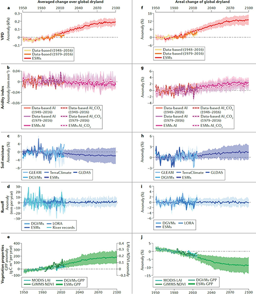 王旭辉研究员、中科院青藏高原研究所汪涛研究员,以及清华大学杨雨亭研究员。该成果获得国家自然科学基金(41991230和41988101)和第二次青藏高原综合科学考察研究专项(2019QZKK0405)等项目资助。 原文链接://www.nature.com/articles/s43017-021-00144-0 图1:不同干旱指数的平均值变化(左列)及其指示的干旱区面积变化(右列) 图2:全球干旱区大气-水文-生态-社会经济系统未来变化的示意图