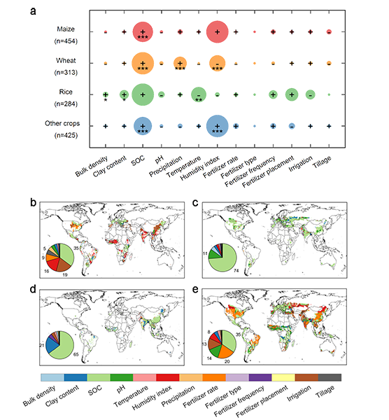 周丰课题组在Nature Food上发表题为“Global mapping of crop-specific emission factors highlights hotspots of nitrous oxide mitigation”的研究论文,首次揭示了全球农田氧化亚氮(N2O)排放因子(EF)的空间分异及其生物地球化学机制,并量化了全球农田N2O减排潜力。 氧化亚氮(N2O)是单分子增温潜势较二氧化碳(CO2)高300倍(100年时间尺度)的强效温室气体,其在大气中寿命可达百年之久,也是平流层臭氧最主要的破坏者。农业是最大的N2O人为排放源,其中农田氮肥施用(含化肥和有机肥)是其主要贡献者。因此,减少农田N2O排放对全球升温控制在2°C 以内是至关重要的。 农田N2O减排潜力取决于EF和施氮阈值,准确确定EF的空间格局,以及量化兼顾粮食和环境安全的施氮阈值目前面临的主要挑战。周丰课题组联合7个国家科研人员,建立了完整且具有更高代表性的全球农田土壤N2O排放通量同化系统,确定了可验证的不同作物的施氮阈值,利用“自下而上和自上而下”耦合方法体系,系统回答3个科学问题:1、全球农田EF的空间异质性多大?2、全球和区域尺度下关键驱动因素是什么?3、在粮食和环境安全前提下,全球农田N2O减排潜力多大,哪里最有效? 研究发现,1)农田N2O EF的空间分异达2个数量级,在以往观测盲区存在多个EF高值区(如中美洲、东南亚、北欧);2)不管是全球还是区域尺度,环境条件(湿润指数、SOC和粘土含量)均是农田N2O EF地域分异的主导因素,而非传统认为的农艺管理措施(图1),通俗地讲,自然条件通过调控“水-土-气”界面化学过程来塑造着N2O排放因子的格局,且调节着农艺管理对排放因子的影响程度;3)在不影响作物产量的情况下,全球农田土壤N2O可减排30%,相当于中国和美国的农田土壤N2O排放之和,其中65%的全球减排潜力集中在20%的播种面积(亚热带湿润气候或潜育土和强淋溶土,图2),换句话说,“小范围,大潜力”,为实现环境和粮食安全的协同效益提供了科学依据。 图1 农田氧化亚氮排放因子空间分异的多尺度驱动因素。a. 全球尺度,b-e. 栅格尺度(3.75° ´ 3.75°) 图2 全球农田氧化亚氮减排潜力 注:图中数字表示20%全球作物收获面积所实现的累积减排潜力 杏吧原创