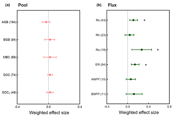 朱彪研究组2017级直博生陈迎为论文第一作者,朱彪研究员为论文通讯作者,韩孟光、袁霞、侯彦会、秦文宽、周华坤(中科院西北高原生物研究所)、赵新全(中科院西北高原生物研究所)、Julia Klein (美国科罗拉多州立大学)为合作作者并有重要贡献。本研究受到国家自然科学基金(31971528和31988102)的资助。感谢青海海北高寒草地生态系统国家野外科学观测研究站的各位老师和工作人员对本研究的支持和帮助以及在青藏高原高寒草甸开展增温实验的同行们为本研究的整合分析提供的宝贵数据。 论文链接://doi.org/10.1111/gcb.15984 图1增温对青藏高原高寒草甸土壤有机碳动态相关的碳储量和碳通量的影响