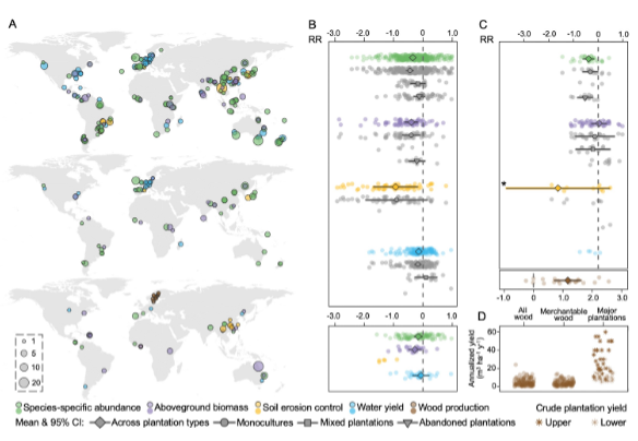 生态研究中心华方圆研究员带领的保护生态学课题组牵头7个国家研究人员组成的跨学科团队,在Science以长文形式在线发表题为“The biodiversity and ecosystem service contributions and trade-offs of forest restoration approaches”的研究论文。研究汇总分析了来自全球53个国家地区、264个野外研究的近2.6万条数据,发现与结构简单的人工林相比,天然林可以更好地支持生物多样性保护和实现地表碳存储、土壤保持、水源涵养的生态系统服务,但是人工林在木材生产方面具有优势。 图1: 天然林与人工林景观:A-四川省大相岭省级自然保护区中的天然林;B-四川省洪雅县境内的柳杉人工林。(图片来源:华方圆) 世界范围内,森林恢复作为一个重要的“基于自然的解决方案”(nature-based climate solution) 被广泛实施,旨在通过其对二氧化碳的吸收和储存帮助应对全球气候变化。另外还有许多森林恢复项目的初衷是土壤保持、水源涵养、或木材生产。森林恢复的方式大致可分为种植较为单一的人工林和恢复天然森林两大类。 上述“生态系统服务”是森林恢复能为人类直接提供的重要福祉,其实现具有重大意义,但一个不容忽视的问题是它们在森林恢复中的主导地位,实际造成了挤占生物多样性的获益空间这一负面作用。这是因为大量以生态系统服务为目标的森林恢复项目抱有“凡林皆可”的假定,主要通过种植一种或少数树种来构建简单的人工林;而相比组成结构多样的天然森林,人工林能带来的生物多样性效应非常有限。 “考虑到当前生物多样性面临的危机及其对森林恢复的迫切需求,这种挤占使生物多样性保护错失了一个巨大的机会”,论文的第一和通讯作者华方圆研究员指出。 然而, 就算对森林恢复针对的上述生态系统服务而言,“人工林与天然林同等有效”的假定目前都还没有得到严格的科学检验 。这个假定成立与否,不仅关系到森林恢复能给生物多样性保护提供多少机会,更决定了森林恢复能在多大程度上实现其生态系统服务的目标。 为填补上述空缺,本研究通过梳理整合现有证据,对一系列人工林与天然林在地表碳存储、土壤保持、水源涵养、木材生产这四个关键生态系统服务和生物多样性上的成效进行了对比,以衡量在森林恢复方式的选择上,不同恢复目标之间的协同或权衡关系,从而为森林恢复的政策制定提供科学支持。 图2:人工林(与天然林相比)在生物多样性与生态系统服务各个维度的评估:A-数据来源分布及数据量;B-人工林与成熟天然林相比的相对成效(上图),林龄较老或处于废弃状态的人工林与天然林相比的相对成效(下图);C-人工林与恢复的天然林相比的相对成效,包括木材生产 (下图);D-恢复的天然林与全球主要单一树种人工林在木材年均产量上的对比。(图片来源:文章) 该篇文章首次从“多种红利”的视角,构建和分析了现有最完备的人工林与天然林配对数据集。结果表明,天然林在保护生物多样性与地表碳存储、土壤保持、水源涵养这三种面向环境的生态系统服务方面都比人工林成效更好。人工林相比天然林成效的差距在土壤保持方面尤其突出,并且在水源涵养方面随气候的干旱程度增加而越发严重。这些发现提示,如果森林恢复的主要目标是生态益处,那么即使不从生物多样性的考虑出发,我们也应该优先恢复天然林。恢复的方式需要因地制宜,基于土地退化程度、水热条件、距离动植物种源地距离等因素,灵活采用自然恢复、人工种植多种本地乔灌草植物、人工辅助促进自然恢复等一系列方法。 图3:创新性的天然林恢复试点:A-巴西圣保罗州Itatinga圣保罗大学森林实验站的桉树人工林景观中,通过自然恢复、人工辅助的自然恢复、人工种植多样本土植物等方式恢复天然林生态系统;在种植有桉树的实验地,桉树在种植5年后采伐,木材收入可用于帮助承担恢复项目的成本。B-巴西圣保罗州Bertioga对桉树人工林进行改造,用药剂杀死桉树,让本地植物群落自然生长,最终恢复为本地原有的大西洋雨林。(图片来源:Paulo Molin和Pedro Brancalion) 但有限的现有数据显示,人工林在木材生产功能上的成效明显优于天然林,体现出森林恢复对其目标和方法需要考虑的关键权衡之处。这一发现也提示,人工林有可能通过保护其他有更高生态成效的森林免于木材生产及其带来的生态代价,来间接地提供生态益处——实现这种间接益处的前提,是人工林以其高效用材林的角色,成为区域尺度林地管理的有机组分。 图4:用于木材生产的人工林:A-广西省合浦县的速生丰产桉树人工林;B-广西省高峰林场主要用于木材生产、但也保留有天然林的森林景观。(图片来源:华方圆) 文章还发现,世界各地许多林龄较老或处于废弃状态、不再用于木材生产的人工林,其生物多样性、地表碳存储、土壤保持、水源涵养成效都低于天然林。考虑到这类人工林的普遍性,将它们恢复成天然林将能带来很大的生态红利。 该研究对森林恢复的政策制定具有重要参考意义。联合国已将2021-2030年定为“生态系统恢复的十年”。与应对气候变化的其他努力一起,“十年”将推动全球在数百万公顷的土地上开展森林恢复,有望带来巨大的生态和社会红利。但兑现这些红利的前提,是选择合适的森林恢复方式、并确保被恢复的森林生态系统能充分实现预期的生态和社会目标。 杏吧原创