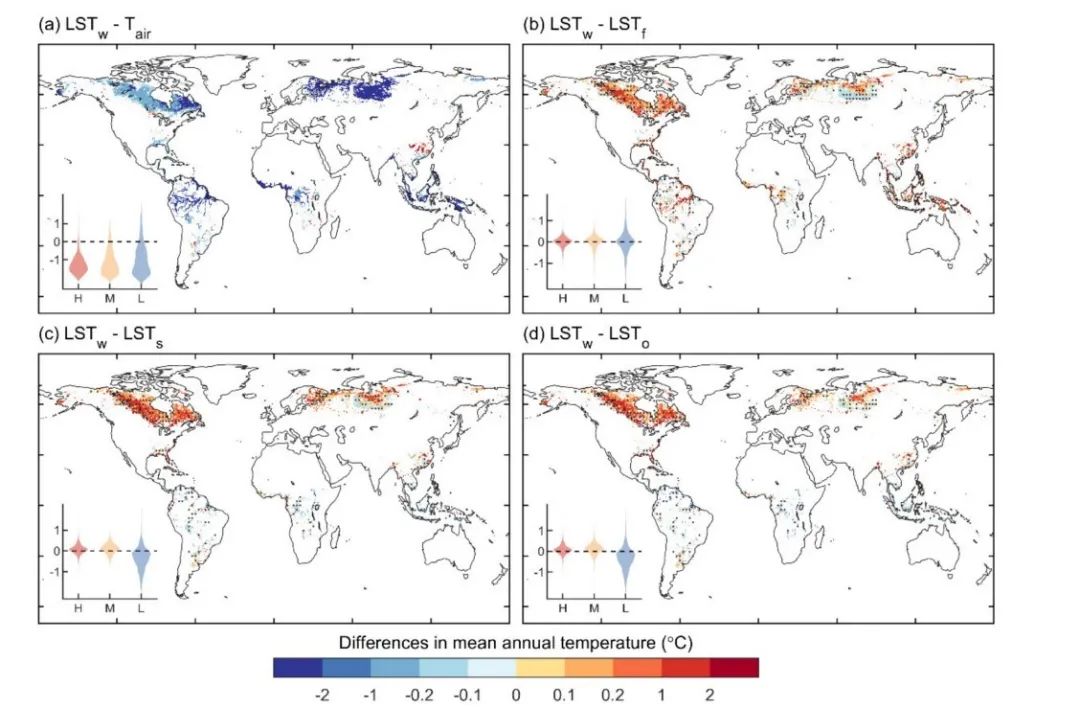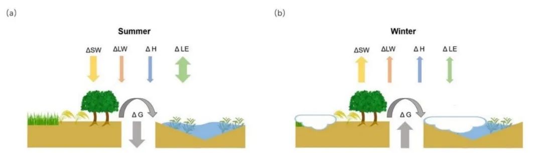 2016级自然地理与资源环境专业学生吴语萱同学拔尖计划研究成果“Wetlands Cool Land Surface Temperature in Tropical Regions but Warm in Boreal Regions”以第一作者在《Remote sensing》发表文章。 湿地在全球水文和生物地球化学循环中发挥着重要作用。区域气候调节是天然湿地最重要的生态系统服务功能之一。然而,在全球尺度上,湿地对局地温度的影响和归因仍不清楚。本研究利用卫星产品(地表温度LST、反照率albedo和蒸散发ET)来评估湿地与邻近土地覆被类型的地表温度差异及其可能的驱动因素。 图1 全球湿地分布格局 研究发现,多年平均上,湿地对热带地区有降温作用,但对北方地区有增温作用。北方地区55%以上的地区 ΔLST为正;在热带地区超过70%的区域 ΔLST为负值。同时,湿地对地表温度的影响在北方地区表现出明显的季节性:即湿地在冬季有增暖效应,而在夏季有降温效应。 图2 湿地与气温,森林,灌丛,草地和耕地温度差的空间格局 研究提供了湿地与其他土地覆被类型之间夏季和冬季地表热量收支差异。湿地与其他土地覆被类型albedo和ET的差异只能解释地表温度差异时间变化的30%。由于湿地的蓄水量较大,地面热通量(G)可以解释湿地的其他影响,在湿地夏季吸收能量,在冬季释放能量,这在以往的研究中经常被忽视。 如今,人们对湿地恢复以缓解气候变化越来越感兴趣。湿地恢复可显著降低氮污染、甲烷和CO2排放,并改变局部生物物理过程。本研究强调了未来大面积湿地恢复的潜在气候效益。由于不同地区的湿地具有不同的气候效应(升温或降温),因此应认真考虑不同地区湿地恢复的气候效益。 图3 夏季(a)和冬季(b)湿地与其他土地覆盖类型的地表能量收支 杏吧原创