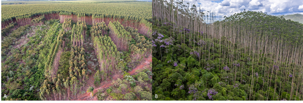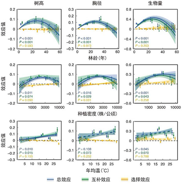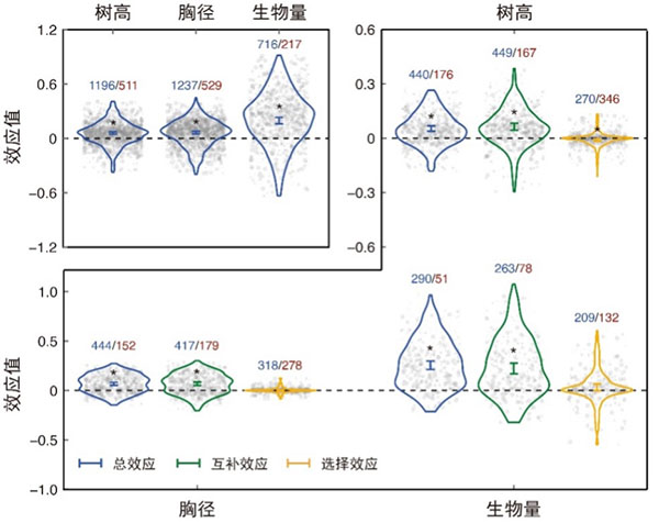 生态研究中心华方圆团队和方精云团队的两项重要研究成果,分别以“The biodiversity and ecosystem service contributions and trade-offs of forest restoration approaches”,和“Multispecies forest plantations outyield monocultures across a broad range of conditions”为题发表,揭示了不同森林恢复方式对生物多样性和生态系统服务的影响以及混交林的增产效应。 这两项研究在不同森林恢复模式的生态效益及人工林生态系统功能方面取得重大突破,解决了这两个领域长期悬而未决的理论问题,成果丰富和发展了生物多样性与生态系统功能研究,为森林恢复的政策制定提供了科学支持,也为相关理论在生产实践中的应用搭建了桥梁,具有重要科学和实践意义,受到学术界的高度关注。《科学》杂志同期配发了著名生态学家Jessica Gurevitch教授题为“Managing forests for competing goals”的评述,对两项研究给予了高度评价。 森林恢复方式:天然林与人工林的权衡 华方圆研究员带领保护生态学课题组,牵头7个国家研究人员组成的跨学科团队,汇集、分析了来自全球53个国家地区、264个野外研究近2.6万条数据,回答了何种森林恢复方式能最优地发挥森林的多种生态和生产功能。 长久以来,全球森林恢复多以人工林为主导恢复方式,对天然林恢复的重视不足,两类森林恢复方式在储碳、保土、蓄水、生物多样性保护以及木材生产等生态系统服务方面缺乏系统评估,孰优孰劣,争论不休。针对这一争论,该研究构建了当前最完备的人工林与天然林配对数据集,首次从“多种红利”视角比较了人工林与天然林的生态系统功能,分析了生物多样性与上述生态系统服务在不同森林恢复方式中的协同与权衡关系。结果表明,与结构简单的人工林相比,天然林可以更好地支持生物多样性保护,更好地实现地表碳存储、土壤保持、水源涵养的生态系统服务,但是在木材生产方面却逊色不少。该结果表明,森林恢复需要认真考虑目标与方法,尤其是生产效率与生态效益之间的权衡。文章进一步发现,世界各地许多林龄较老或处于废弃状态、不再用于木材生产的人工林,其生物多样性、地表碳存储、土壤保持、水源涵养成效都低于天然林。考虑到这类人工林的普遍性,将其恢复成天然林将能带来很大的生态红利。 图1:创新性的天然林恢复试点:A-巴西圣保罗州Itatinga圣保罗大学森林实验站的桉树人工林景观中,通过自然恢复、人工辅助的自然恢复、人工种植多样本土植物等方式恢复天然林生态系统;在种植有桉树的实验地,桉树在种植5年后采伐,木材收入可用于帮助承担恢复项目的成本。B-巴西圣保罗州Bertioga对桉树人工林进行改造,用药剂杀死桉树,让本地植物群落自然生长,最终恢复为本地原有的大西洋雨林。(图片来源:Paulo Molin和Pedro Brancalion) 人工造林的抉择:混交林增产效应的启示 人工造林是当前全球森林恢复的主要方式之一。生态学理论和营林实践都表明,相较于单一树种的纯林,多树种的混交林通常能提供更丰富多样的生态系统功能。但混交种植能否促进树木生长和森林生产力始终未能得到科学的解答。方精云-王少鹏团队突破传统野外观测和控制实验研究的局限性,利用人工混交和纯林配对数据,系统分析了人工林生态系统的生产功能及其形成机制。研究团队历时5年,构建了包含255个站点、243个树种、5900余组配对数据的全球混交林实验数据库(Global MixTrees);基于该数据库探究了混交种植对森林生态系统三个主要生长要素(树高、胸径、地上生物量)的影响,以及多种生物因素(物种组成、林龄、种植密度)和非生物因素(温度、降水)对混交效应的调控规律。 图2 混交林在三个生长指标(树高、胸径和生物量)上的混交效应(其中正值表示混交林的生长指标高于纯林) 研究发现,混交林的树高、胸径和生物量均显著高于纯林,平均增加量分别为5.5%、6.8%和25.5%。分析表明,这种增产效果主要由种间互补作用所致(见图2)。进一步分析发现,物种性状组成是影响增产效果的关键因素:不同叶型(针叶和阔叶)混交比单一叶型混交的增产效果更好;不同叶生活史(落叶和常绿)混交比单一生活史混交的增产效果更好;不同养分获取策略(固氮和非固氮)混交与单一养分获取策略混交的增产效果相似。 图3. 混交林的增产效应随林龄、种植密度和温度的变化 研究还发现,混交林的增产效应随着林龄和种植密度的增加呈单峰变化,峰值出现在林龄25年左右和种植密度2500~4100株/公顷之间(图3);气候条件也影响增产效果:高温地区增产效果更明显,但降水变化对增产效果的影响不显著。此外,研究还显示,随着混交物种的增加,增产效应呈现增加趋势。该研究系统阐明了混交种植的增产效应及其机制,在解决森林经营生产中久而未决的理论和实践问题上取得了重大突破,为全球人工造林和经营管理提供了科技支撑。 对森林生态系统保护与恢复的指导意义 联合国已将2021-2030年定为“生态系统恢复的十年”。与应对气候变化的其他努力一起,在这十年中,联合国将推动全球在数百万公顷的土地上开展森林恢复,有望带来巨大的生态和社会红利。但兑现这些红利的前提是:选择合适的森林恢复方式,并确保被恢复的森林生态系统能充分实现预期的生态和社会目标,满足这些前提需要更深入的生态学研究。 北大生态研究中心的这两项研究为森林生态系统恢复提供了重要的