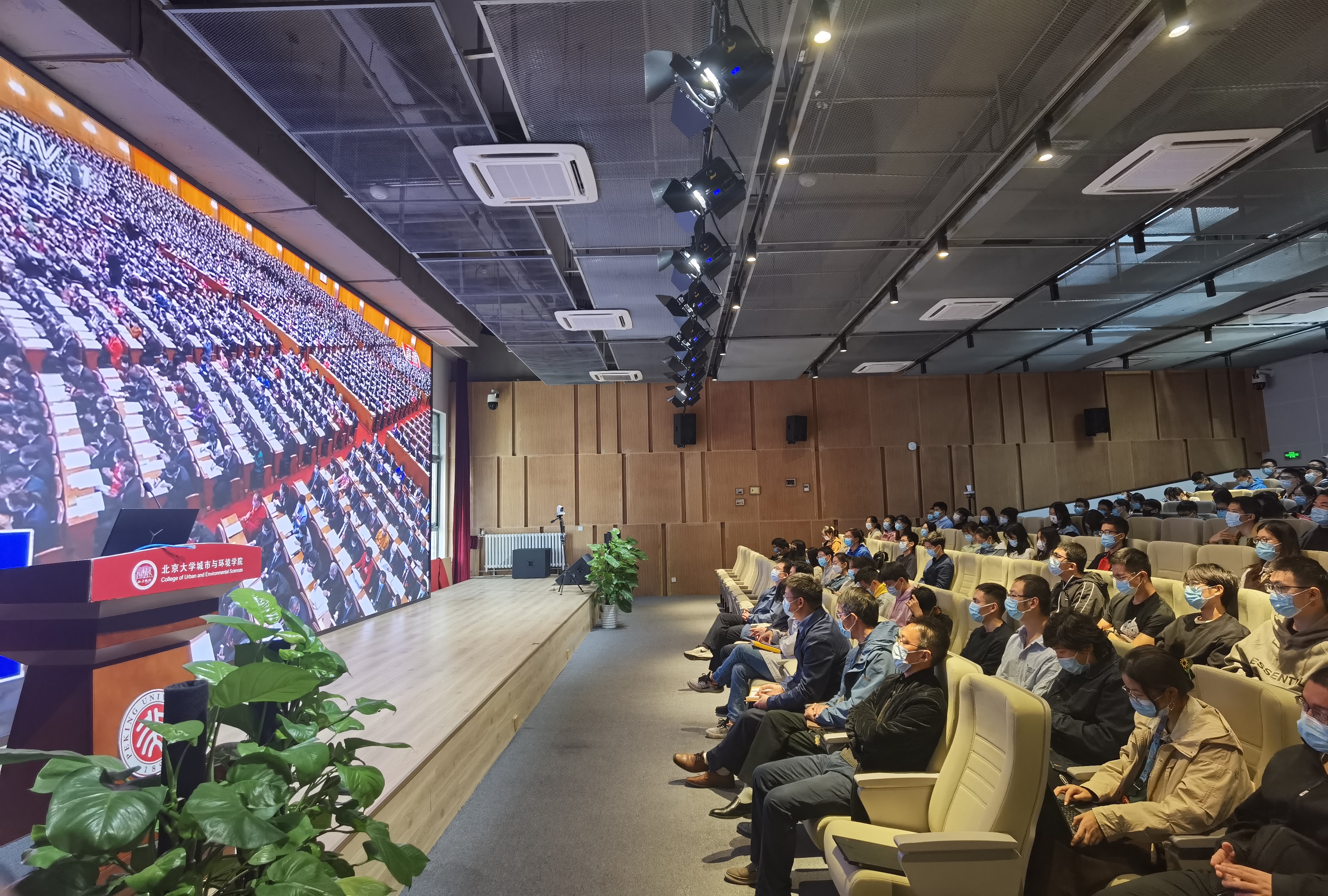 党委书记彭建、院长贺灿飞、副院长曹广忠、副院长王志恒党委副书记陈耀华、党委副书记张新平等党政班子成员,部分师生党员、民主党派代表、团校全体学员集中观看学习了中国共产党第二十次全国代表大会开幕式。 党委书记彭建向师生强调二十大重要意义 开幕式前,院党委书记彭建引导全体师生学习二十大精神。他指出,二十大的召开将给未来5-10年带来极其深远的影响,作为北大学子、城环学子,要为国家的富强民主、人民的幸福而奋斗,同学们更要从自身专业的角度出发,思考如何利用专业知识,参与到未来的建设中。希望全院师生能从习总书记的讲话中提炼与自身专业相关的讯息,将此次学习二十大精神的感悟,将对于党的深厚情感,融入到今后的学习工作中,在自己的岗位上为党和国家的建设添砖加瓦。 参会人员集体默哀 报告厅主会场集体学习二十大开幕式 杏吧原创