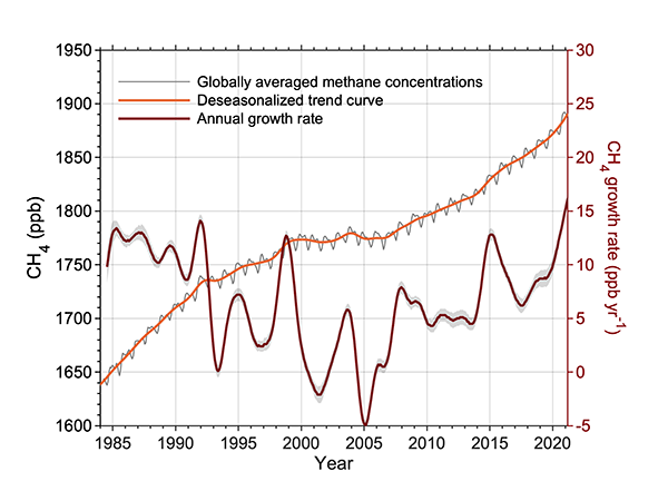 甲烷是一种重要的温室气体。自工业革命以来,大气甲烷浓度增加了2倍,在所有温室气体的辐射强迫中占比三分之一。要实现《巴黎协定》的温室气体减排目标,将全球温升控制在2 °C以内,削减人为甲烷排放降低大气甲烷浓度迫在眉睫。近十五年大气甲烷浓度呈现增长加速的趋势,2020年甚至达到了1984年以来有站点观测记录的最大值。如果未来大气甲烷浓度持续加速增长,将会对减排和巴黎协定温控目标的实现带来严峻挑战。因此,亟需回答大气甲烷浓度为什么近期增长加速这一国际难题。 大气甲烷浓度增速主要受人为源排放、自然源排放和大气汇共同控制,然而由于这三部分估算的不确定仍难以对大气甲烷浓度增速进行归因,尤其是大气汇的贡献最具挑战。2020年由于新冠疫情的蔓延及各国防疫措施的实施,人为甲烷排放有所降低,但大气甲烷浓度却反而飙升,提供了控制人为排放研究大气甲烷浓度的完美“实验”。 图1 大气甲烷浓度观测曲线。灰色为观测值,橙色为趋势线,棕色为增速 面对上述挑战和机遇,杏吧原创