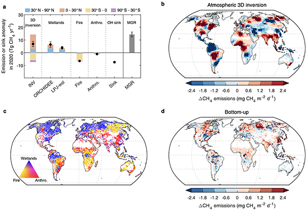 彭书时研究团队与多所国内外研究机构合作,基于大气甲烷浓度观测、能源和农业清查数据、气象和遥感等多源数据,利用湿地过程模型、大气化学传输模型和大气反演模型,结合“自下而上”和“自上而下”的温室气体源汇评估方法,探究了2020年大气甲烷浓度飙升之谜。 研究发现,相比于2019年,2020年人为甲烷排放减少了1.2百万吨,火灾甲烷排放减少了6.5百万吨。2020年更暖更湿的气候使得湿地甲烷排放增加了2.5 – 9.4百万吨,主要源自高纬度湿地和北半球热带湿地。然而,湿地排放增加量的最大值(9.4 百万吨)仍不足以解释2020年大气甲烷浓度的飙升,暗示着甲烷大气汇在2020年可能减少。 大气甲烷主要通过与大气对流层中的OH自由基反应来移除。OH自由基寿命极短,难以直接测量,是研究大气甲烷汇变化最为棘手的难题。研究发现,由于2020年新冠疫情人为排放的氮氧化物减少,由大气化学传输模型模拟得到的对流层OH自由基浓度平均减小了1.6%,这与另一种基于大气中三种氟化气体浓度反演得到的OH自由基的变化相吻合。2020年大气OH自由基浓度降低导致了大气甲烷汇减少了7.5百万吨。 研究进一步发现,由“自上而下”评估方法得出的甲烷排放变化空间格局与“自下而上”的结果相一致,佐证了自然排放增加由湿地排放增加主导。因此,2020年大气甲烷浓度增长加速一半归因于由湿地主导的自然排放增加,另一半归因于对流层OH自由基浓度的降低。 该研究为理解全球的甲烷收支提供了新见解,揭示了湿地甲烷排放对实现全球温控目标不可忽略,并认识到未来甲烷减排计划需要同时考虑氮氧化物等人为污染物排放趋势变化所导致的大气甲烷寿命变化,为《巴黎协定》的温升目标实现和全球甲烷减排承诺提供了科学依据。 图2 2020年大气甲烷浓度飙升的归因。相比于2019年,a, 2020年大气甲烷浓度增长加速的归因;b,基于“自上而下”大气反演方法估算的甲烷排放变化的空间格局;c,2020年甲烷排放变化主导源的空间格局;d,“自下而上“方法估算的甲烷排放变化的空间格局。 研究成果以“湿地排放和大气汇的变化解释了2020年大气甲烷浓度增加(Wetland emission and atmospheric sink changes explain methane growth in 2020)”为题,于2022年12月15日发表在《自然》(Nature)上,杏吧原创