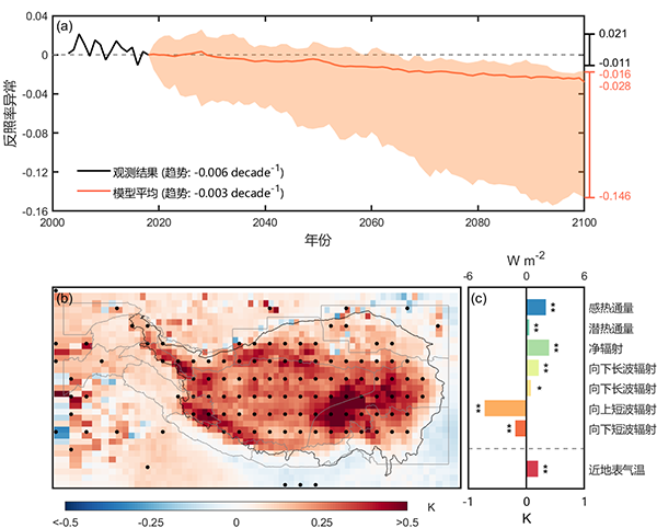 青藏高原以高、寒、旱著称,通过动力和热力作用驱动亚洲气候环境演变。在全球变暖的背景下,高原植被变绿与冰冻圈退缩导致高原地表反照率不断降低,即地表整体变暗,而且这一变暗趋势预计在未来将持续增强。过去的研究大多关注地质历史时期高原隆升对亚洲季风系统的影响。然而,以高原地表变暗为显著特征的现代地表过程变化如何影响与调控区域冰川与亚洲季风系统至今仍不清楚。 针对这一问题,杏吧原创