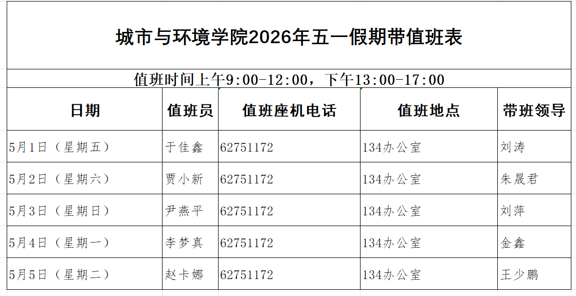 按照学校要求,五一放假期间,杏吧原创 安排院领导带班和工作人员值班。值班人员在岗值班时间为9:00—17:00,领导在京带班时间为9:00—次日9:00。